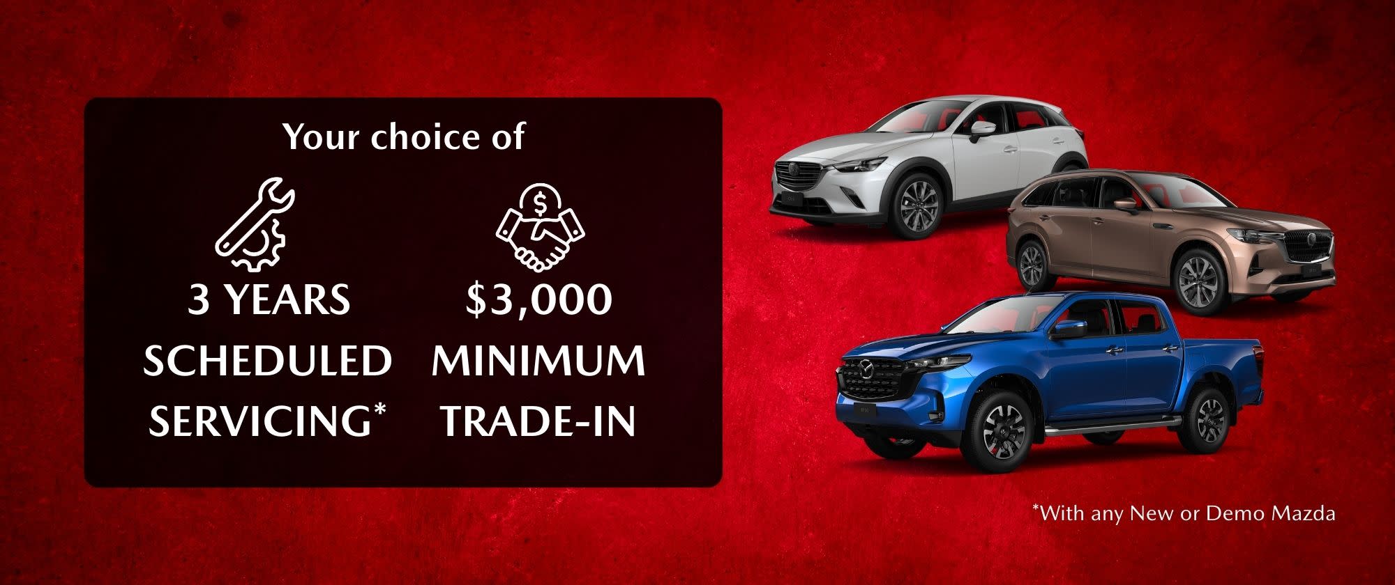 Take your pick of a $3,000 MINIMUM TRADE-IN OFFER or 3 YEARS FREE SCHEDULED SERVICING for your new Mazda.
